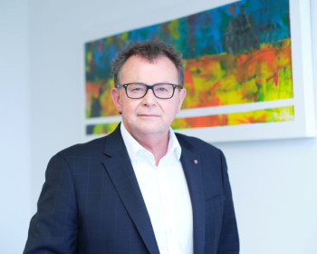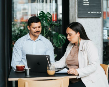 A man and a woman sit at a cafe table looking at a laptop. The man has dark hair and a moustache and is wearing a light blue shirt. The woman has long, dark, straight hair and a moko on her chin. She is wearing a beige blazer and a brown top.