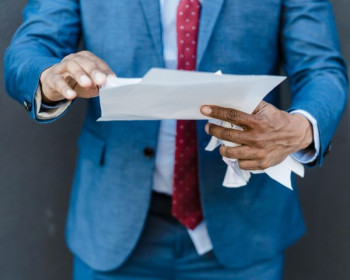A man in a blue suit with red tie is cropped so you can see his torso and arms. He is dark skinned. He is holding papers.