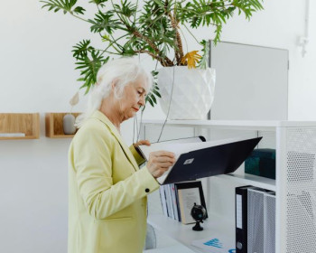 An older white woman with white hair and a light yellow blazer looks at a file in an office.