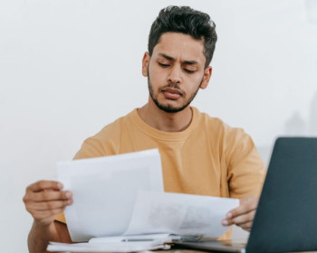 A man with dark hair and beard looks at some paper documents. He seems to be concentrating.