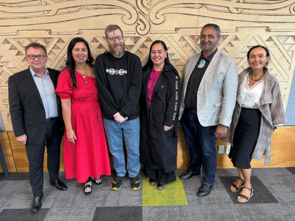 Māori Reference Panel members (L-R): Privacy Commissioner Michael Webster, Mercia-Dawn Yates, Chris Cormack, Māhera Maihi, Kura Moeahu, and Tahu Kukutai