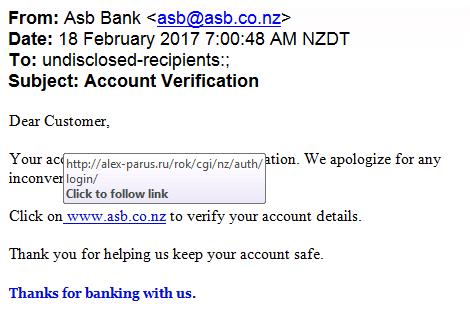 The basic phishing email below is an example. It shouldn’t have been addressed to “undisclosed-recipients” as your bank can address an email just to you. And you can see the box that popped up when the mouse cursor was held over the link. An address of “alex-parus.ru/” does not seem likely for a New Zealand company to use.