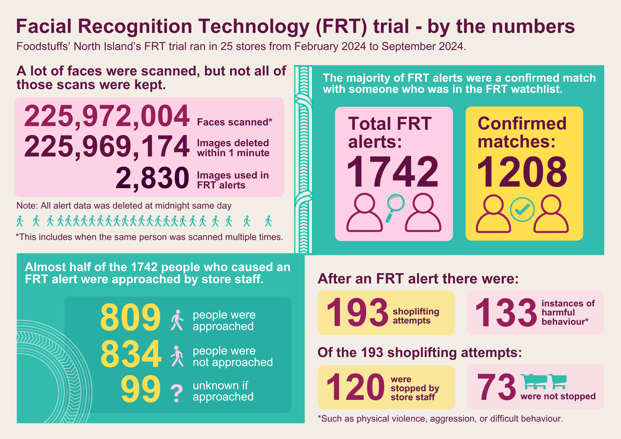 The FRT trial started on 8 February and ended on 7 September 2024 and ran in 25 supermarkets. During the trial, 225,972,004 faces were scanned (includes multiple scans of the same person), with 99.999% of these deleted within one minute, and there were 1742 alerts of which 1208 were confirmed matches. See our infographic of FRT by the numbers.