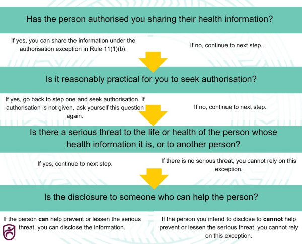 Rule 11 of the Health Information Privacy Code (HIPC) allows you to disclose health information if it is necessary to prevent or lessen a serious threat to the life or health of any person, or public health or safety (the serious threat exception). In each case, there are requirements that must be met for the serious threat exception to apply. If another piece of legislation requires or allows you to share the health information in question you should rely on that legislation rather than Rule 11.