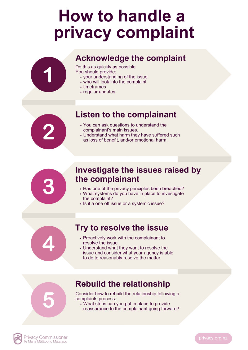 Read more detailed guidance on handling privacy complaints in our Poupou Matatapu guidance.